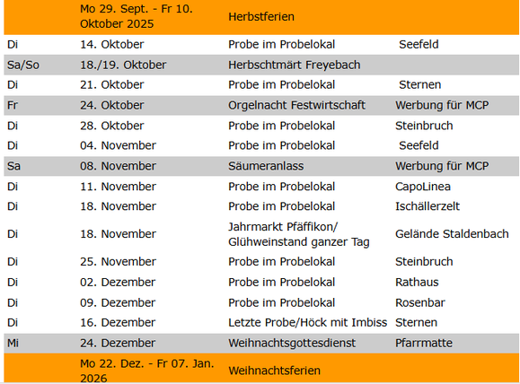 Der Männerchor Pfäffikon am Etzel lädt ganz unverbindlich am Di 22.10.2019 mögliche und unmögliche Herren in welchem Alter auch immer zu einem Apéro zwecks gegenseitigen beschnuppern ganz herzlich in die Sportanlage Chrummen in Freienbach ein.